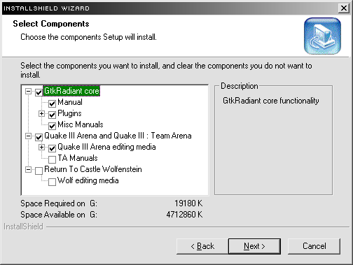 - The components you want to select are the GtkRadiant Core, Manual, Plugins, Misc Manuals. Under the Quake 3 option, select the Quake III Editing media. Everything else is optional. See this screenshot.